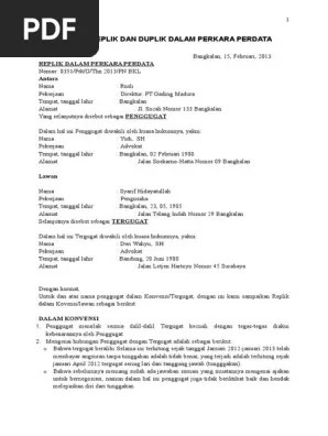 P.2 dalam duplik , sedangkanmenurut tertio acara perdata duplik dahulu baru pembuktian ;e . Bambang sugeng a.s., sujayadi, 2012, pengantar hukum acara perdata dan contoh. Contoh replik dan duplik dalam perkara perdata. Putusan replik duplik cerai gugat replik. Untuk dan atas nama tergugat, kuasa tergugat dengan ini mengajukan duplik atas replik penggugat yaitu .