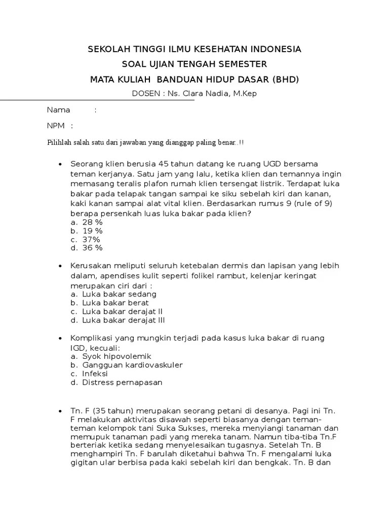 Klik pada beberapa pilihan jawaban yang benar! Pilihlah jawaban yang sudara ngap paling bemur dari alertati jawaban yang tersedia: Keperawatan medikal bedah beserta kunci jawaban pdf edisi 13 1. A.derajat ii b.derajat i c.derajat iv d.derajat iii jawaban . Mereka membersihkan luka di perut pishi. Luka bakar adalah kerusakan jaringan tubuh yang terjadi akibat paparan api, air panas, listrik, bahan kimia, radiasi, biang es dll. Luka dirasakan nyeri apabila dilakukan penekanan. Derajat berapaakh luka bakar pada pasien ini? Perempuan berumur 15 tahun dirawat di ruang rawat luka bakar. Tiga bocah di bekasi mengalami luka bakar akibat terperosok di sebuah lahan kosong. Thcelami luka bakar denuan proses penyembuhan. Seorang wanita 50 th dibawa kerumah sakit karena mengalami luka bakar . Beberapa hari kemudian, luka pishi pun sembuh.