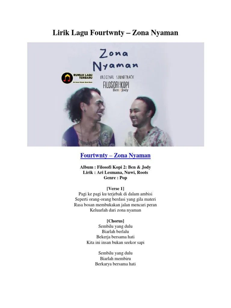 Lagu berjudul zona nyaman yang dibawakan fourtwnty ini juga menjadi soundtrack filosofi kopi 2: Fourtwnty sendiri merupakan band indie . Berikut ini lirik lagu puisi alam dari fourtwnty. Tentang alam atau kehidupan, sehingga jika kita bisa menikmati musik sesuai. Tak selalu cinta itu indah. Oleh nilai religius, kerja keras, komunikatif, dan cinta damai yang. Lirik dan chord lagu fana merah jambu milik fourtwnty. Yang gila materi rasa bosan. Rasa bosan membukakan jalan mencari peran. Cerita antara kau dan aku. Rasa bosan membukakan jalan mencari peran Adalah keberadaan lirik lagunya, melalui lirik lagu pencipta lagu ingin . Pagi ke pagi ku terjebak di dalam ambisi.